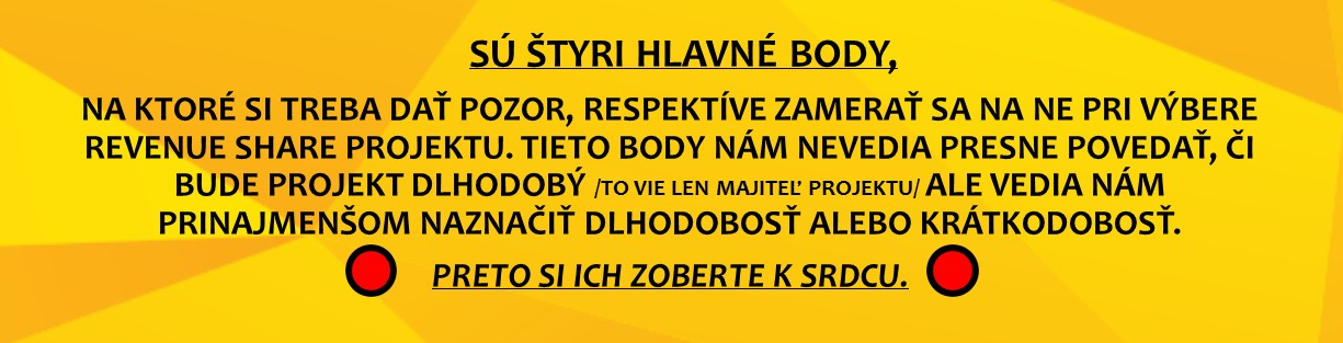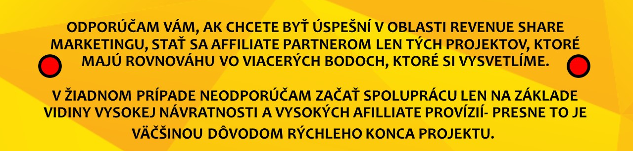Treba si uvedomiť, že REVENUE SHARE MARKETING nie je MULTILEVEL MARKETING. Preto do projektov revenue share marketingu, nepatria affiliate provízie rozdelené do hĺbky štruktúry.Ak chcete budovať štruktúru do hĺbky, odporúčam Vám multilevel marketing. Revenue share marketing je niečo iné. Maximálna výška affiliate provízií, by nemala prekročiť 10%. Naozaj, aby bol projekt udržateľný, affiliate provízie by nemali prekročiť 10%. Pre mňa 3 TOP revenue share projekty, ktoré poznám, majú všetky affiliate provízie maximálne 10%, žiadny z nich nemá vyššie stanovenú províziu. Jeden úspešne prosperuje už 3 roky, ďalší za pár mesiacov oslávi 2. výročie a tretí má viac ako rok.